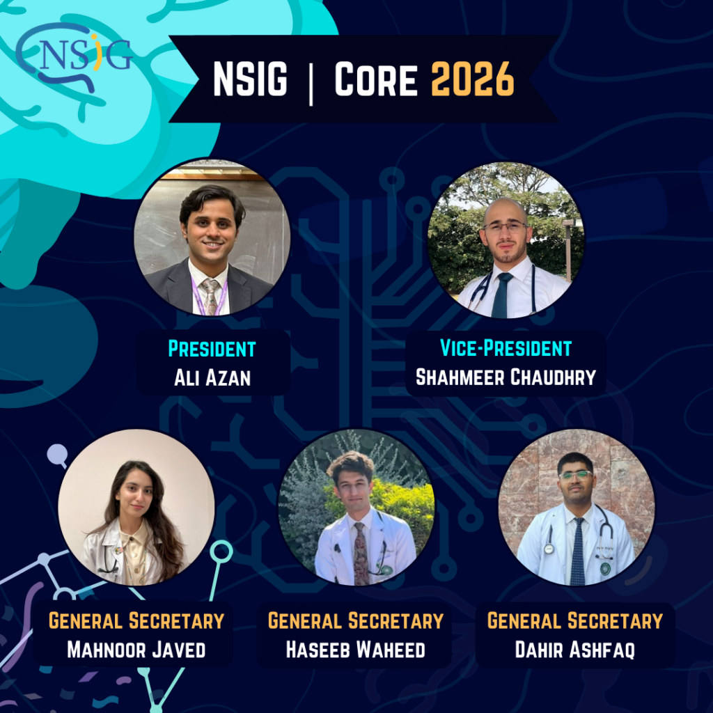 NSIG (Neuroscience Interest Group) is a student-founded society at Aga Khan University, Karachi, Pakistan, under the patronage of Dr. Syed Ather Enam. Our mission is to unite students interested in neuroscience, spanning fields such as neurosurgery and neurology, basic neurosciences, and more. NSIG has grown to include over 100 ambassadors from 30 medical schools across Pakistan, and we are expanding our reach internationally.