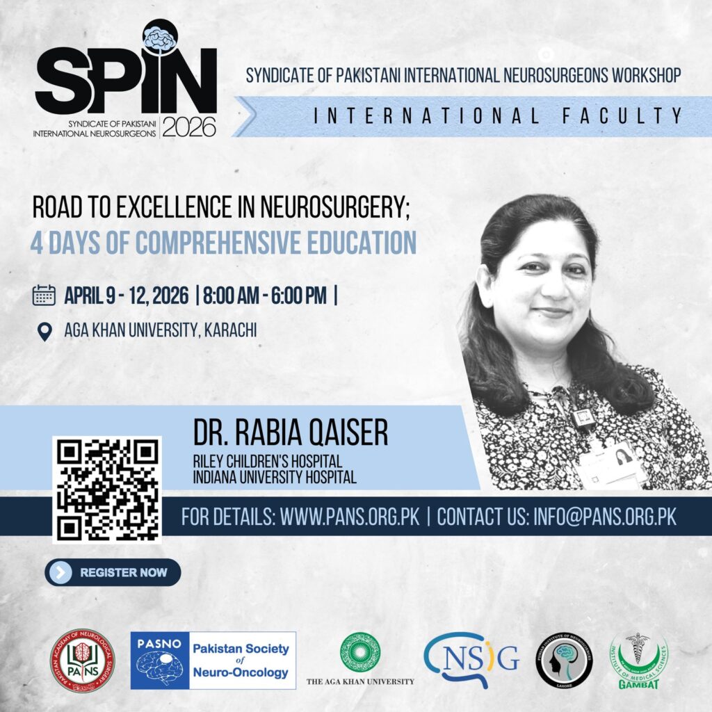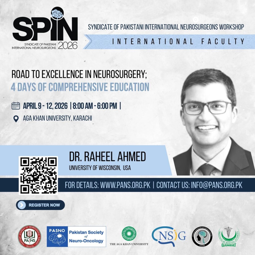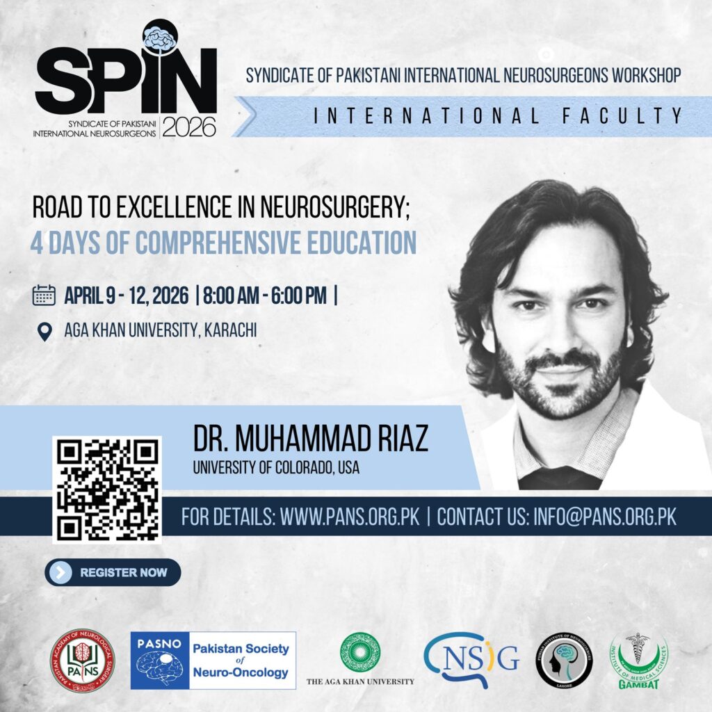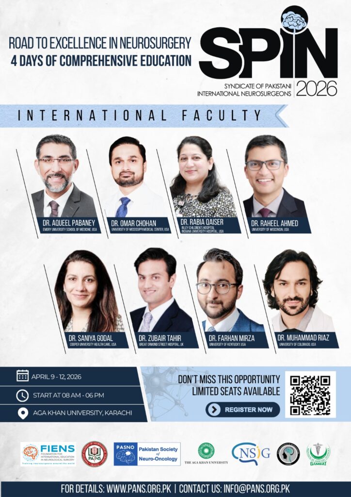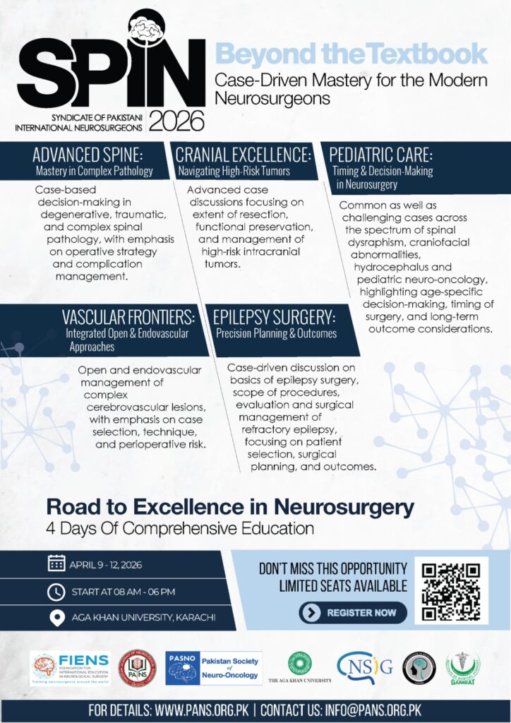 Following the success of SPIN2024 and SPIN2025, we’re thrilled to announce SPIN2026. Join us from April 9 –12, 2026, at Aga Khan University, Karachi, for a cutting-edge neurosurgical experience that continues to break new educational ground.